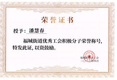 熱烈祝賀我司鐵保宏泰深圳保安公司安保對(duì)眼潘慧春同志榮獲深圳市龍華區(qū)福城街道優(yōu)秀工會(huì)積極分子榮譽(yù)稱(chēng)號(hào)。