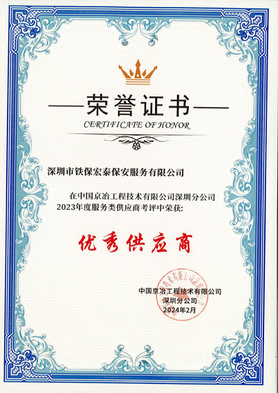 熱烈祝賀我司鐵保宏泰深圳保安服務公司在中國京冶工程技術有限公司深圳分公司榮獲2023年度服務類供應商考評中獲得“優(yōu)秀供應商”稱號。