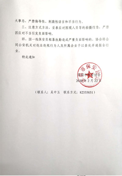 四、因一線保安員粗暴執(zhí)勤造成嚴重負面影響的,協(xié)會將會同公安機關(guān)對違法違規(guī)行為人及所屬企業(yè)予以查處并通報全行業(yè)。